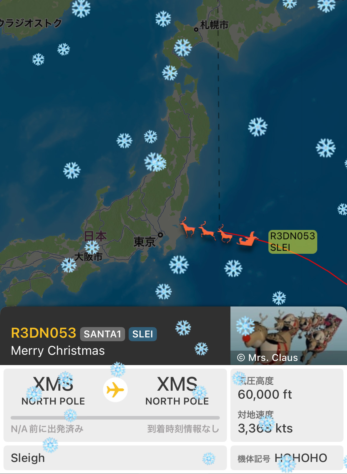 トナカイの曳くソリに乗ったサンタが世界の今どこを飛んでいるのかスマホアプリで追跡するクリスマスの恒例イベントです。
